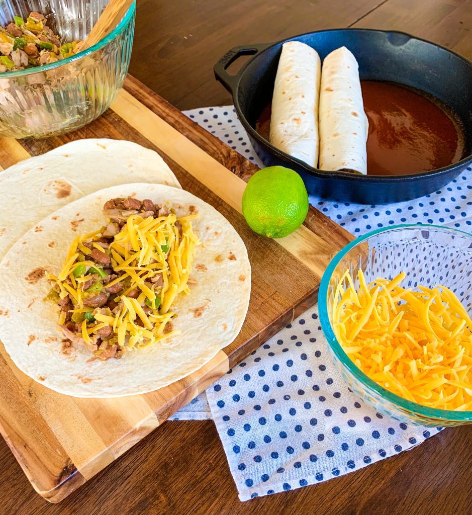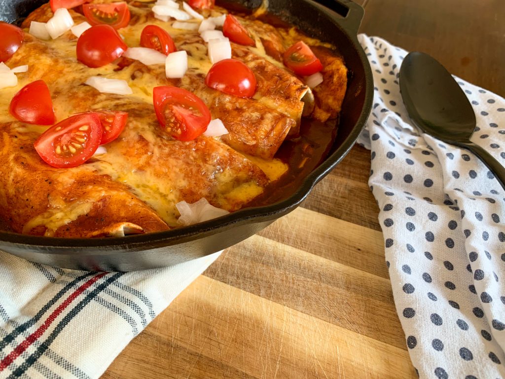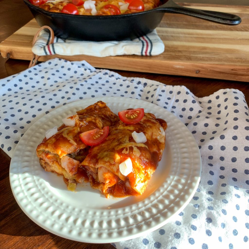 Add a thin layer of enchilada sauce to the bottom of an 8″x 8″ baking dish or 10″ cast iron pan. Fill each tortilla with about 1/2-3/4 cup of filling and a small amount of cheese, roll up and place seam side down in baking dish. Continue until pan is full. Pour remaining enchilada sauce over tortillas, sprinkle with cheese, cover and bake for 30 minutes.