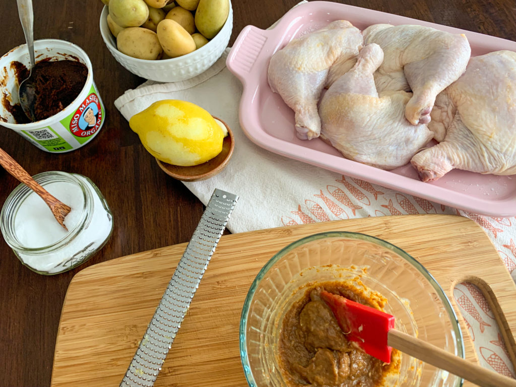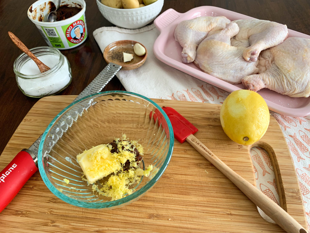 In a small bowl, combine butter, miso paste, olive oil, and zest from 1 lemon. Rub miso-butter mixture all over chicken, including under the skin.