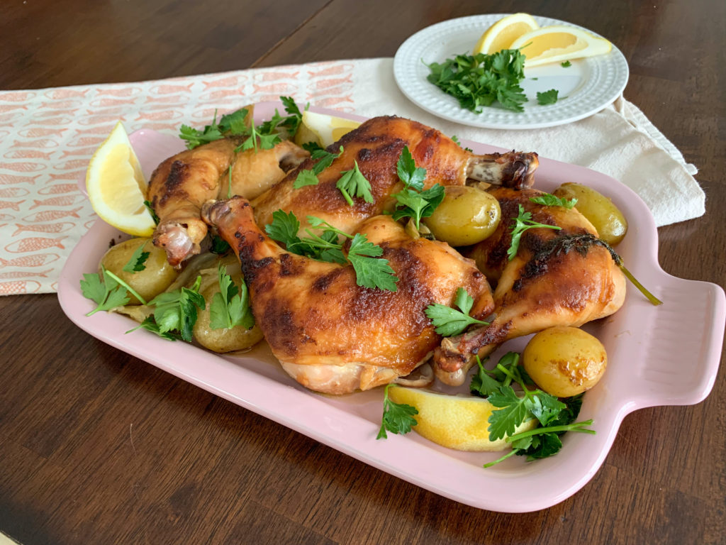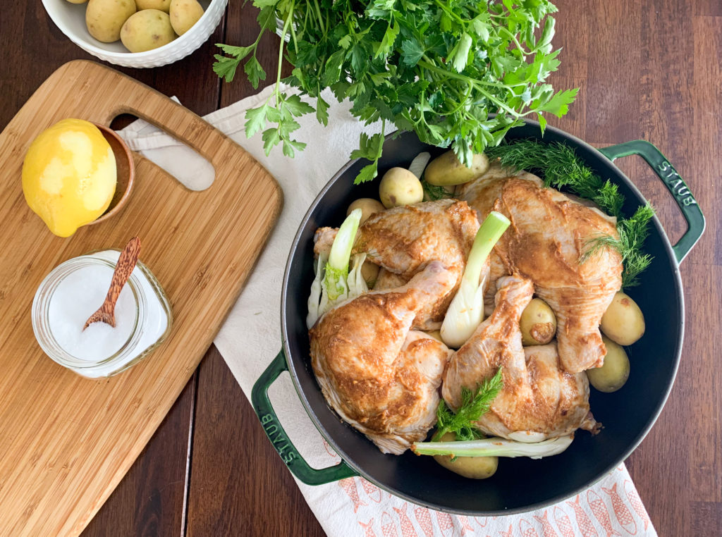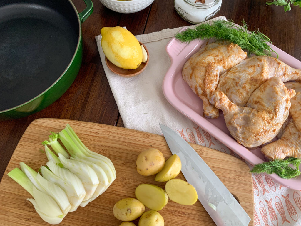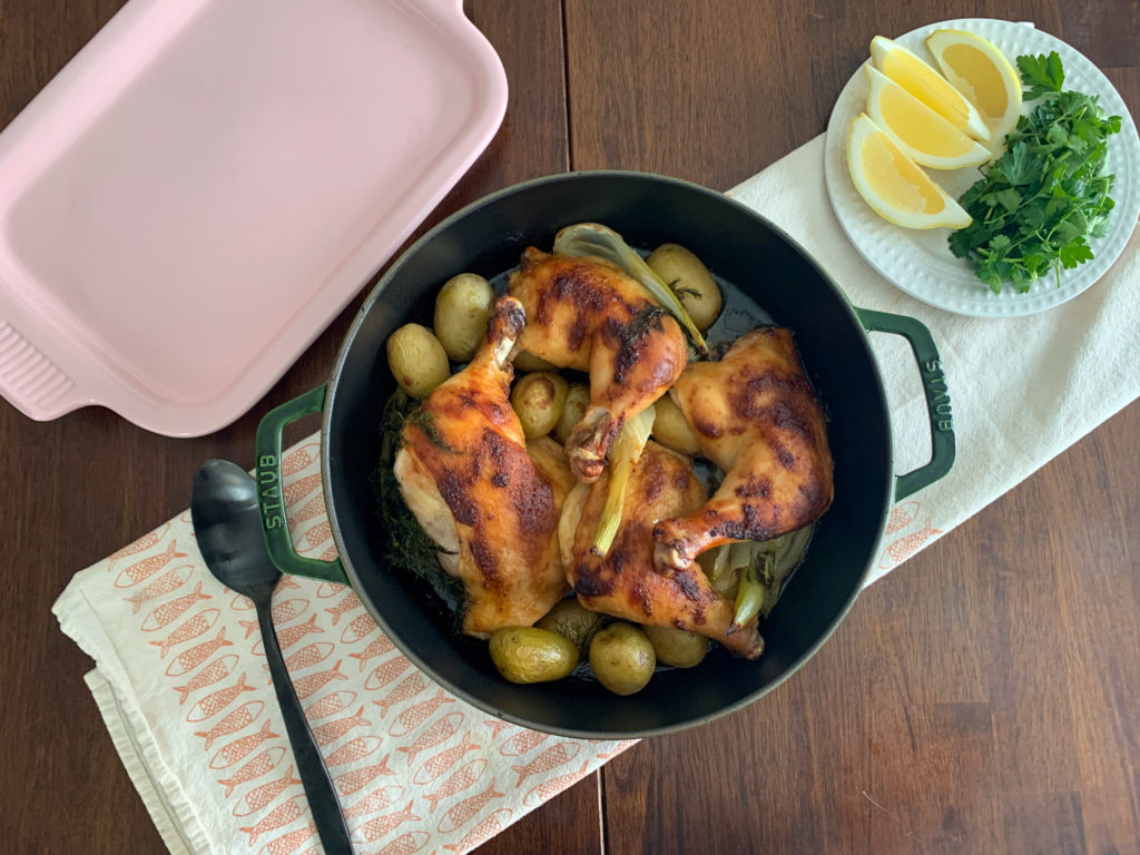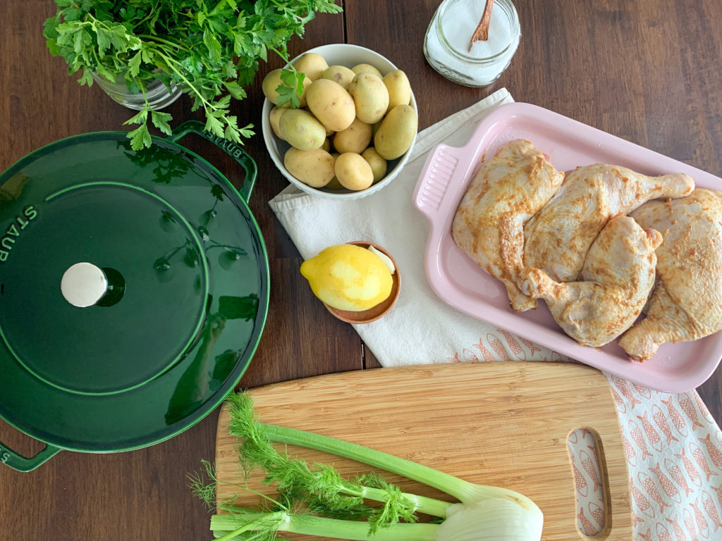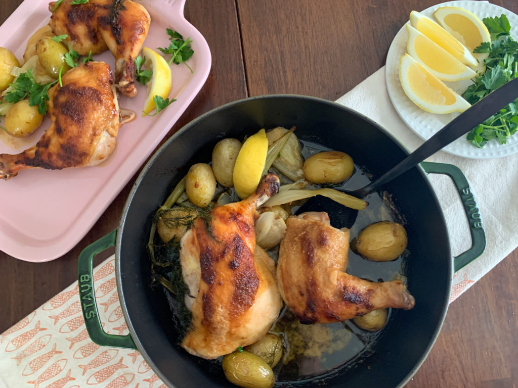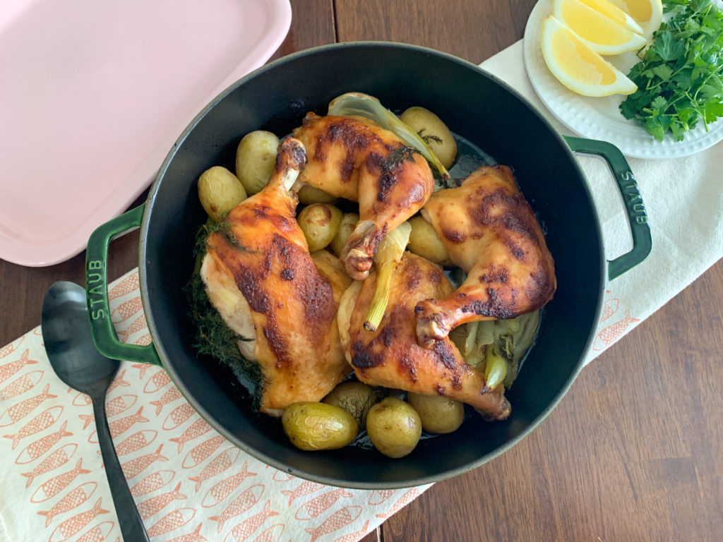 Preheat oven to 425. In a baking dish, ovenproof skillet, or dutch oven, combine potatoes and fennel, season with salt, then place chicken legs on top of vegetables. Slice the lemon into wedges and squeeze half over the chicken, saving the remaining half for serving.