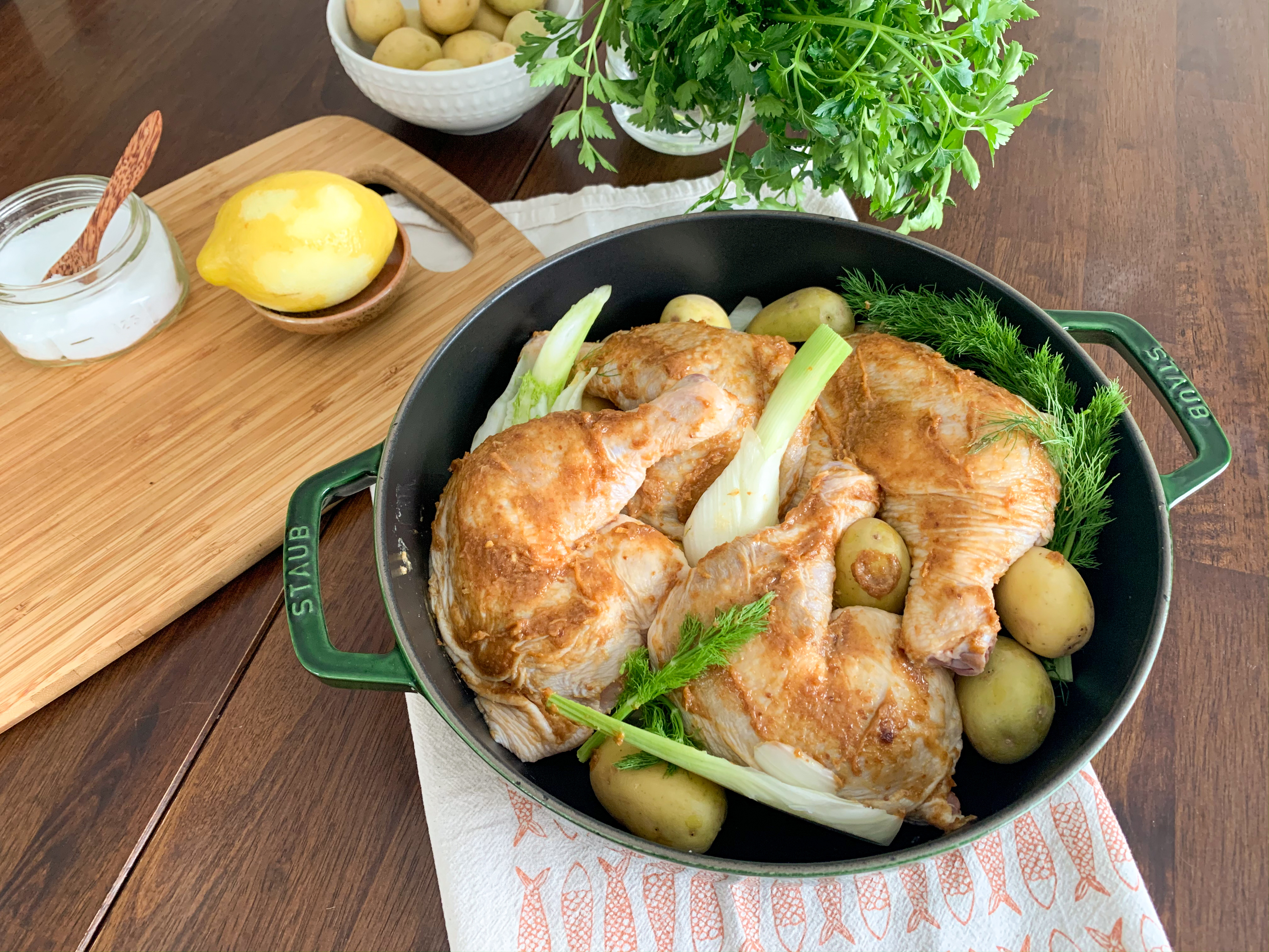Sooooo let’s get into it. This chicken is mad comforting. Like so so so comforting. If you’re looking for something that will make your house smell wonderful and lemon-y and chicken-y, this is the one. I tried to keep it as simple as possible, the only (possibly) tough to find ingredients would be miso paste and fennel.